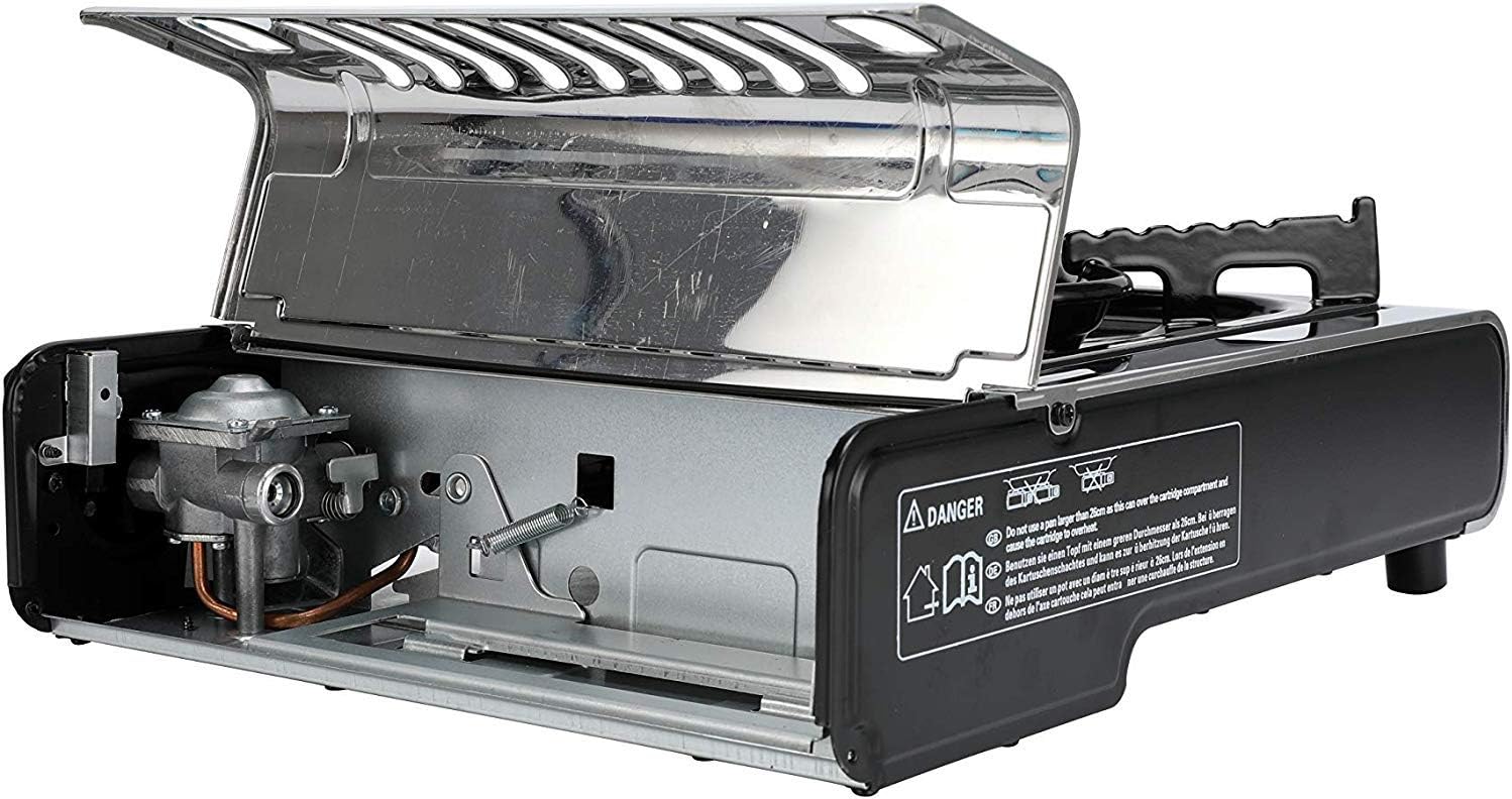 Cocina portátil de 1 quemador para camping, camper y caravana. Funciona con cartuchos de butano tipo B-250, incorpora encendido piezoeléctrico y permite regular la potencia para cocinar de forma rápida y cómoda. Incluye maleta rígida de transporte para guardarla y moverla con seguridad. Conforme a la norma EN 17476.